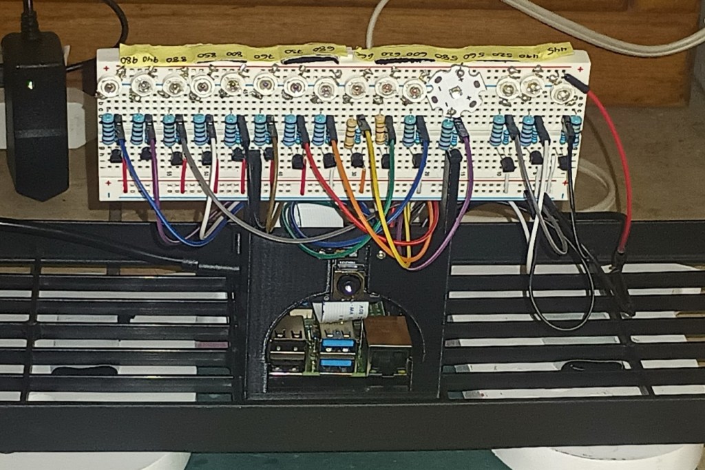Zero will require quite a bit more time, because you will need to do a lot more soldering (about 200 solders). Instead of the solderless breadboard, we used the Electrocookie Prototype PCB Solderable Breadboard for Electronics Projects Compatible for DIY Arduino Soldering Projects, Gold-Plated (5 Pack + 1 Mini Board, Matte Black). This uses the same configurations as in PiMICS Basic (shown at the top of the page), except that all the electronics minus the LEDs can go on the back of the breadboard (basically, look at PiMICS basic and imagine all of the electronics, except for the LEDs on the back of the breadboard). This allows you to put the LEDs right next to the face of a printed camera as shown in the figure below. You can see the small screw up above the LEDs that is holding the breadboard to the camera. It gives your camera a much more aesthetic look and is more robust. Another possibility is to solder wires to all of the LEDs and then glue the LEDs in a desired location, like a circle around your camera.
