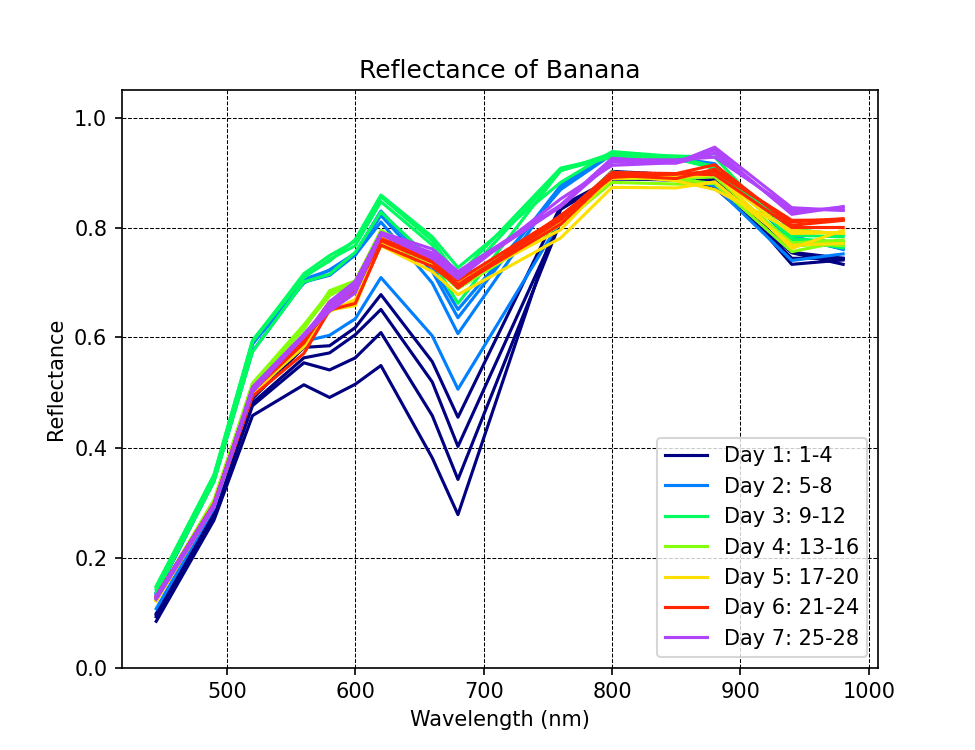 As bananas ripen, there are a host of interesting spectral dynamics that occur. Water, chlorophyll and sugar resonances in the spectrum all change. Nicolas studied the effects of banana ripeness on the reflectance spectra. He used a basic fixed-position, fixed-frequency LED array inside an enclosure (middle). He measured the average reflectance spectra from regions of the banana every 6 hours. This became the reference data. Stay tuned for a GitHub folder as well as an instructional video.
